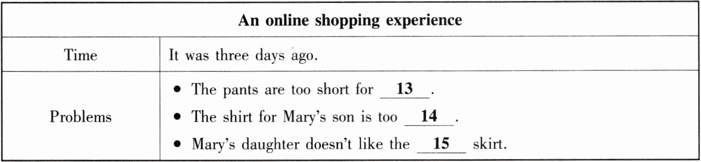听第一篇短文,回答第 13 至 15 小题。请根据短文内容,选择正确答案,完成信息记录表。答题完毕,请等待“嘀”的信号,进入下一篇短文。