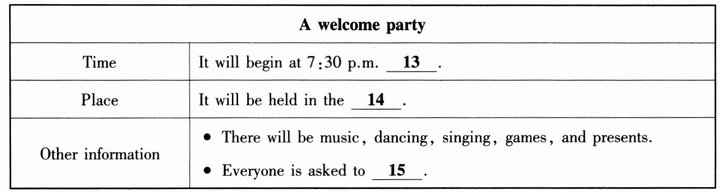 听第一篇短文,回答第 13 至 15 小题。请根据短文内容,选择正确答案,完成信息记录表。答题完毕,请等待“嘀”的信号,进入下一篇短文。