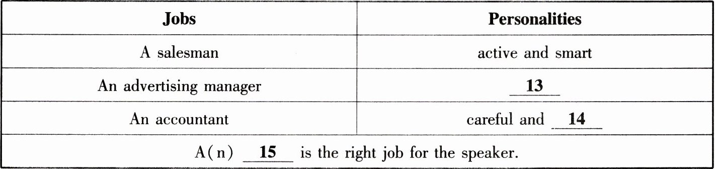 )15. A. accountant B. salesman C. advertising manager答案:13.B 14.C 15.A