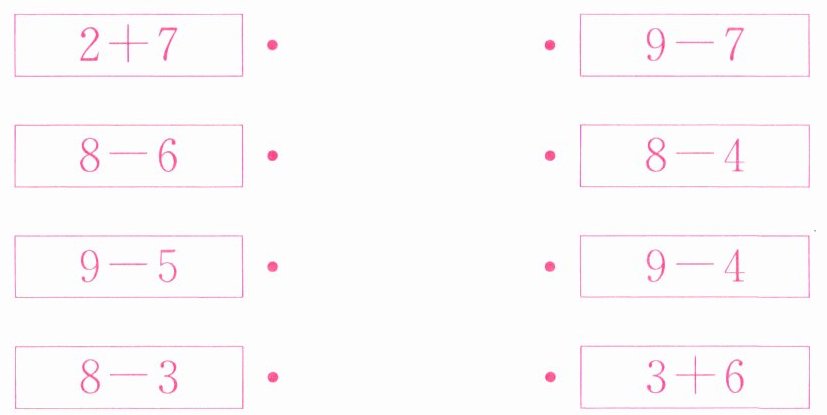 答案:解析:本题考查10以内的加减法运算及匹配相应的算式。需要分别计算出左右两边算式的结果,再将结果相同的算式进行连线。