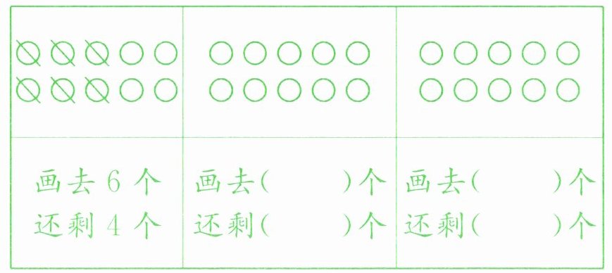第一列:圆圈总数为$6 + 4 = 10$个,画去$6$个,还剩$4$个。