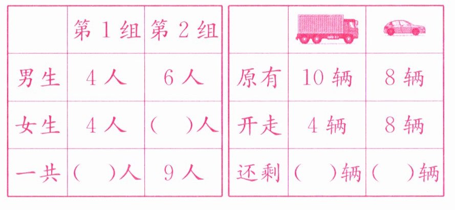 本题可根据表格中已有的信息,通过加减法运算分别求出第$2$组女生人数、第$1$组总人数、第$1$组剩余车辆数以及第$2$组剩余车辆数。