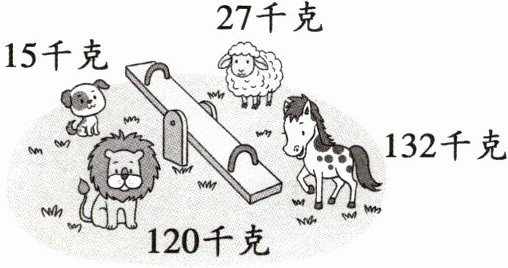 可以将15千克的小狗和132千克的马放在跷跷板一端,27千克的羊和120千克的狮子放在跷跷板另一端。