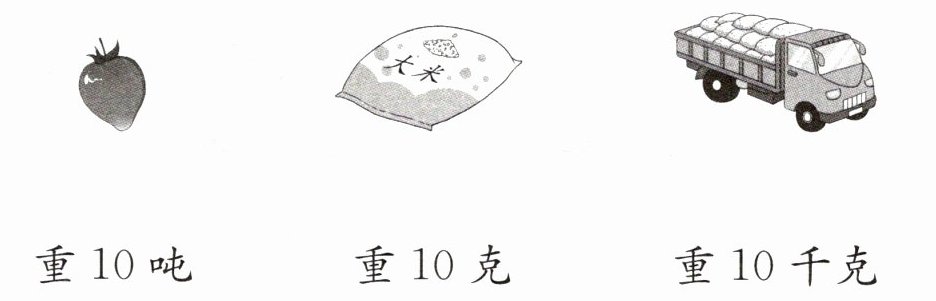综上,草莓连重$10$克;大米连重$10$千克;卡车连重$10$吨。