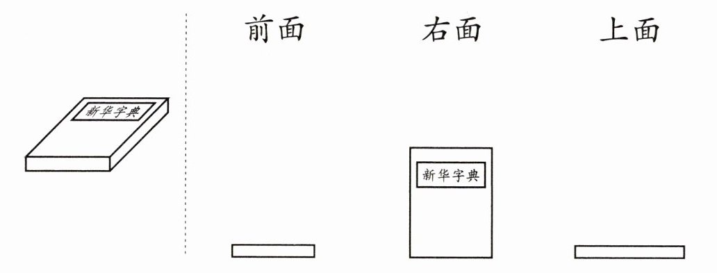 答案:解析:本题考查从不同方向观察物体。从前面看,看到的是长方体的侧面,书名在左侧,即第二幅图;从右面看,看到的也是长方体的侧面,书名在右侧,即第三幅图;从上面看,看到的是长方体的上面,即第一幅图。