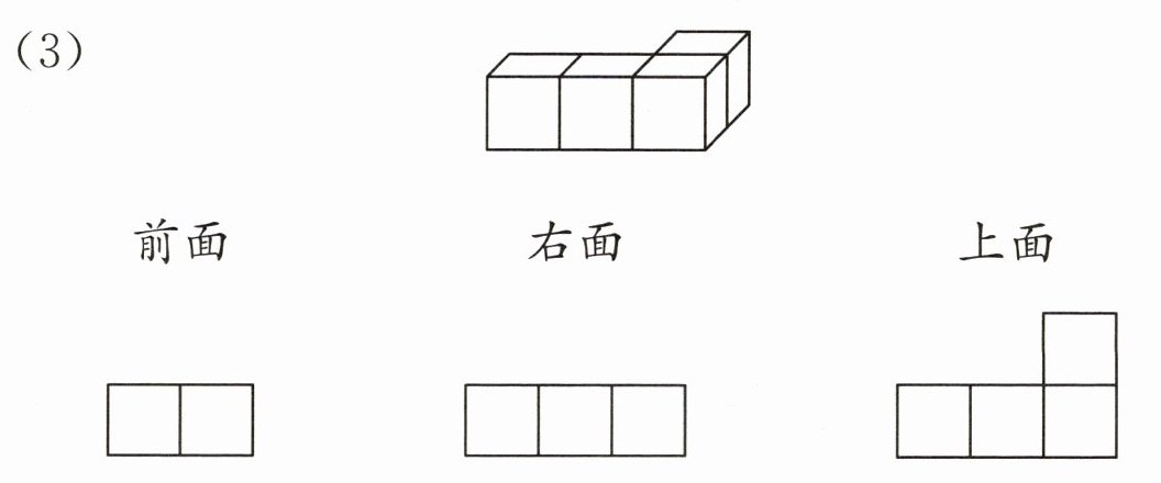 故答案为:前面连第一个图形,右面连第二个图形,上面连第三个图形。