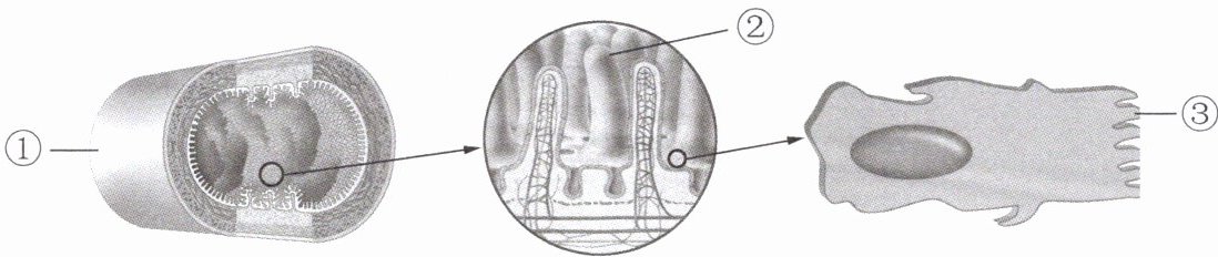 (1)分析题干可知,小肠壁的内表面有大量的环形皱襞,皱襞上有许多绒毛状的突起,叫小肠绒毛,小肠绒毛由黏膜上皮和固有层向肠腔突起而成,结构简图中的②是小肠绒毛;微绒毛是上皮细胞游离面的细胞膜和细胞质向外伸出的微细指状突起。直接从细胞表面自由发出,比绒毛纤细,能使细胞表面积显著增大,有利于细胞的吸收功能,结构简图中的③是微绒毛。小肠绒毛的壁很薄,只由一层上皮细胞构成,而且绒毛中有丰富的毛细血管和毛细淋巴管,毛细血管和毛细淋巴管也很薄也只有一层上皮细胞组成,这些结构特点有利于小肠吸收营养物质。