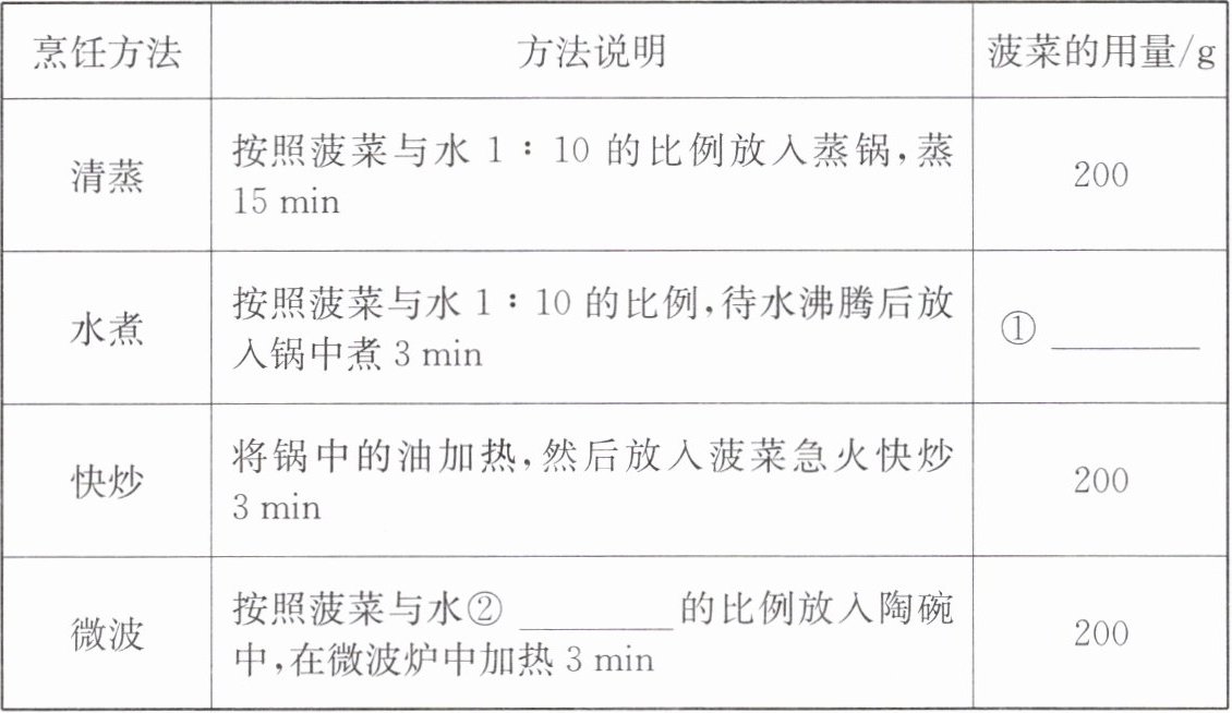 (1)本题考查对照实验的变量唯一性原则。在探究不同烹饪方式对菠菜中维生素C留存率的影响时,除烹饪方式不同外,其他条件都应相同且适宜,所以水煮时菠菜用量也应是200g,微波时菠菜与水的比例应与清蒸时相同,即1:10。