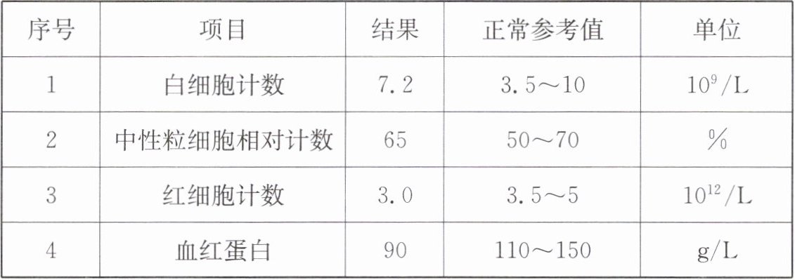 10. 下表所示的是某患者血常规化验单的部分信息,根据血液指标信息,你认为该患者可能患有的疾病是(