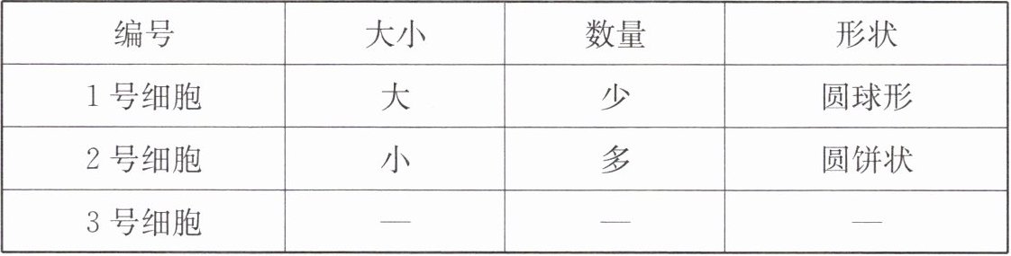 | 1号细胞 | 大 | 少 | 圆球形 |