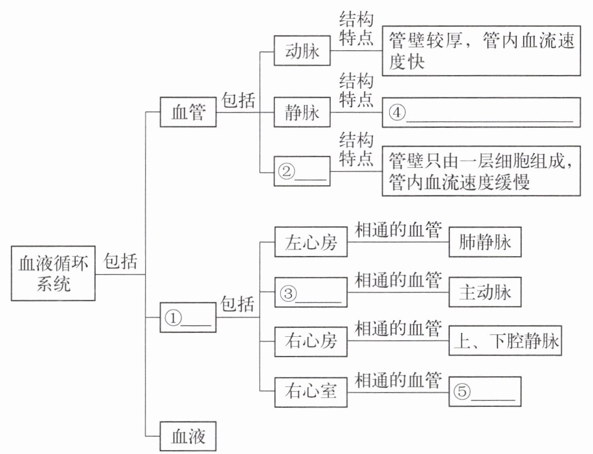 血管包括动脉、静脉和毛细血管。动脉的结构特点是管壁较厚,管内血流速度快;静脉的结构特点我们需要根据后续与心脏相通血管的关系来推断,同时结合静脉的功能等知识,其结构特点是管壁较薄,弹性小,管内血流速度较慢,所以④处填管壁较薄,弹性小,管内血流速度较慢,②处填毛细血管。