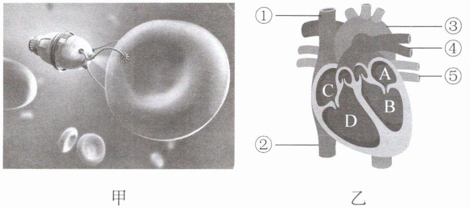 13. 血管机器人(如图甲所示)已逐渐成为医学领域的研究热点之一,它可以在血管中快速稳定地游动和悬浮倒退,可以用于疾病诊断以及对血管进行微创手术。图乙是人体心脏的结构示意图,A~D表示心脏的四个腔,①~⑤表示血管。请据图回答问题。