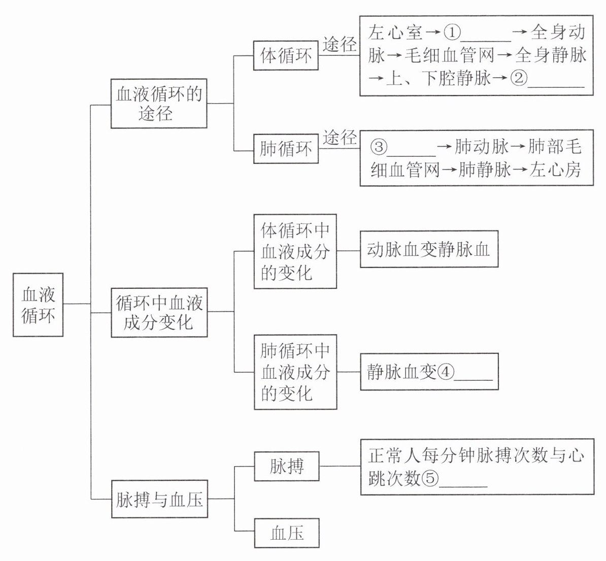 脉搏就是动脉的搏动,正常人每分钟脉搏次数与心跳次数相同。所以⑤处应填相同。