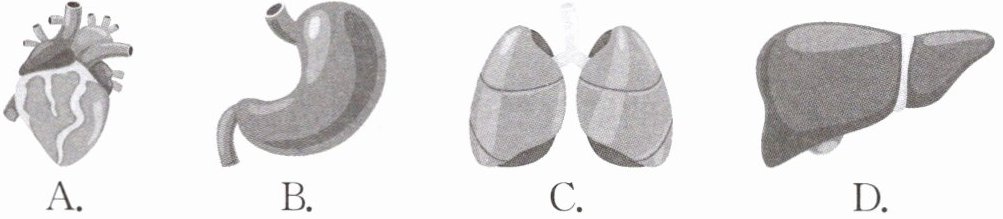答案:【解析】:本题考查人体呼吸系统中主要器官的知识点。呼吸系统的主要功能是进行气体交换,即吸入氧气和排出二氧化碳。在人体呼吸系统中,肺是实现这一功能的关键器官,它具有大量的肺泡,能够与血液进行高效的气体交换。而心脏是血液循环系统的动力器官,胃是消化器官,肝是人体内最大的消化腺,它们都不属于呼吸系统。观察图片可知,A是心脏,B是胃,C是肺,D是肝。