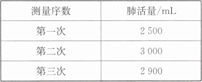 答案:【解析】:本题考查肺活量的概念及测量。肺活量是指在不限时间的情况下,一次最大吸气后再尽最大能力所呼出的气体量,测量肺活量时一般测三次,取最大值。从表格中可以看出,小明三次测量的肺活量分别为2500mL、3000mL、2900mL,其中最大值为3000mL,所以小明的肺活量是3000mL。