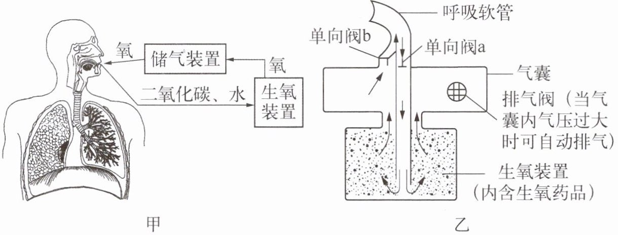 14. 小娜设计了一种在缺氧环境或出现高浓度有毒、有害气体的环境中逃生时使用的自救呼吸器。其设计思路如图甲所示,自救呼吸器的结构如图乙所示(箭头方向表示气体流动方向),请据图回答问题。