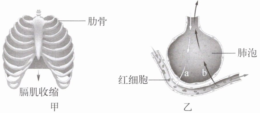 15. 图甲所示的是膈肌的运动,图乙所示的是肺泡与血液之间的气体交换,请据图回答问题。
