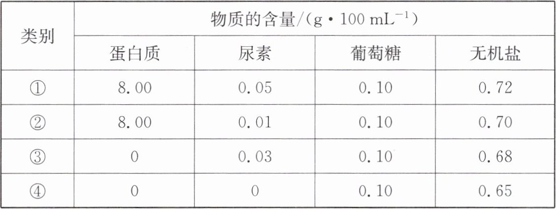 (填表中序号)最有可能表示B管内的物质含量。 | 类别 | 物质的含量$/(g·100 mL⁻^1) $| | | |