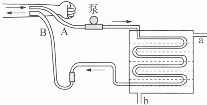14. 为倡导“做中学、用中学、创中学”,某校学生在老师的带领下开展了主题为“设计人工肾脏模型”的项目式学习活动。下图是小军设计的人工肾脏模型示意图,其中A、B表示运输血液的管道,a、b表示运输透析液的管道。请据图回答问题。