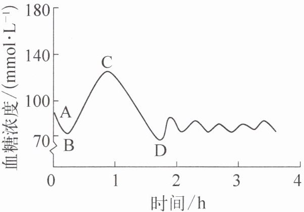 D选项:D点之后血糖浓度保持相对稳定,是胰岛素和胰高血糖素等激素共同调节的结果,需要激素参与调节,该选项错误。