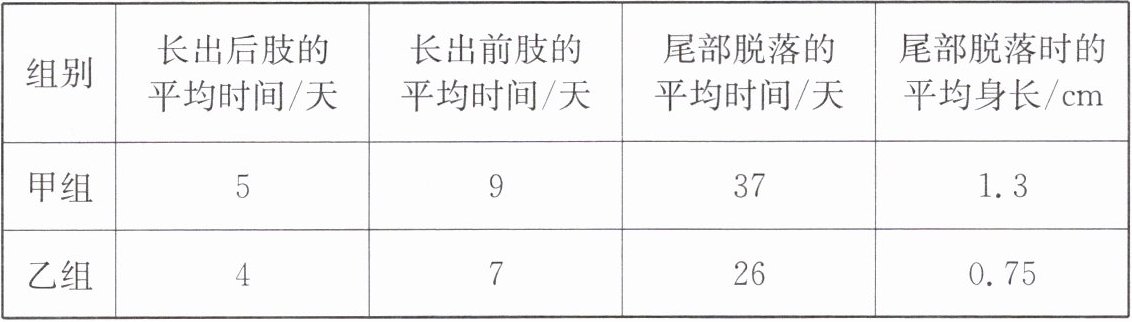 |组别|长出后肢的平均时间/天|长出前肢的平均时间/天|尾部脱落的平均时间/天|尾部脱落时的平均身长/cm|
