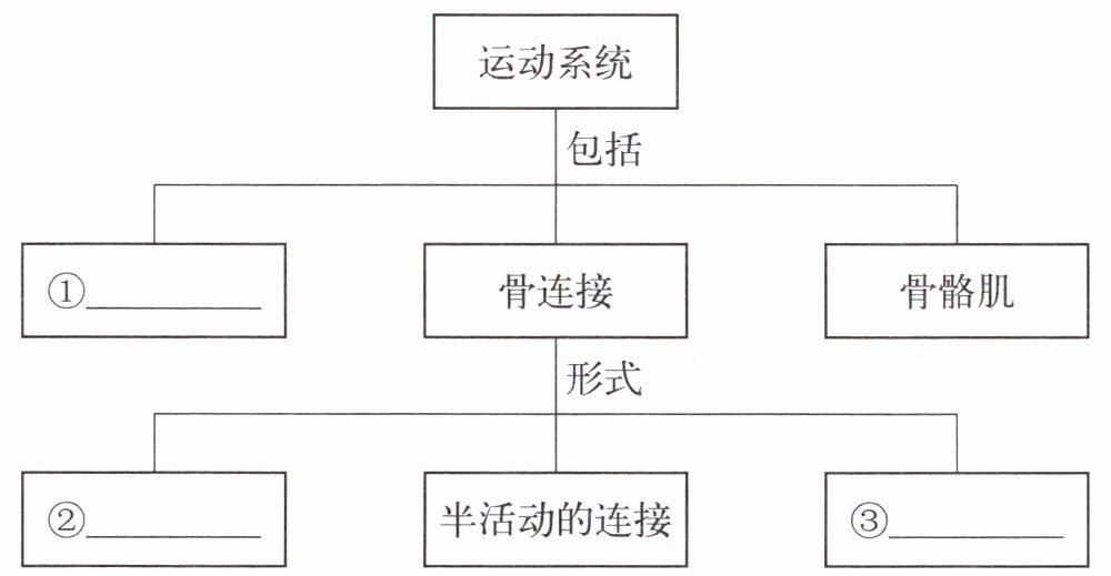 本题考查人体运动系统的组成及骨连接的不同形式。运动系统由骨、骨连接和骨骼肌组成。骨连接有三种形式:不活动的连接(如颅骨之间的连接)、半活动的连接(如脊椎骨之间的连接)和活动的连接(即关节,如肩关节、膝关节等)。