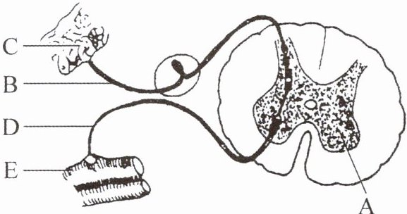 (3)本题考查反射弧的结构和反射的类型。人体完成反射的结构基础是反射弧,反射弧包括感受器、传入神经、神经中枢、传出神经和效应器。眨眼反射的神经冲动传导途径是:C感受器→B传入神经→A神经中枢→D传出神经→E效应器。该反射的神经中枢位于脊髓,属于非条件反射,非条件反射是生来就有的先天性反射。