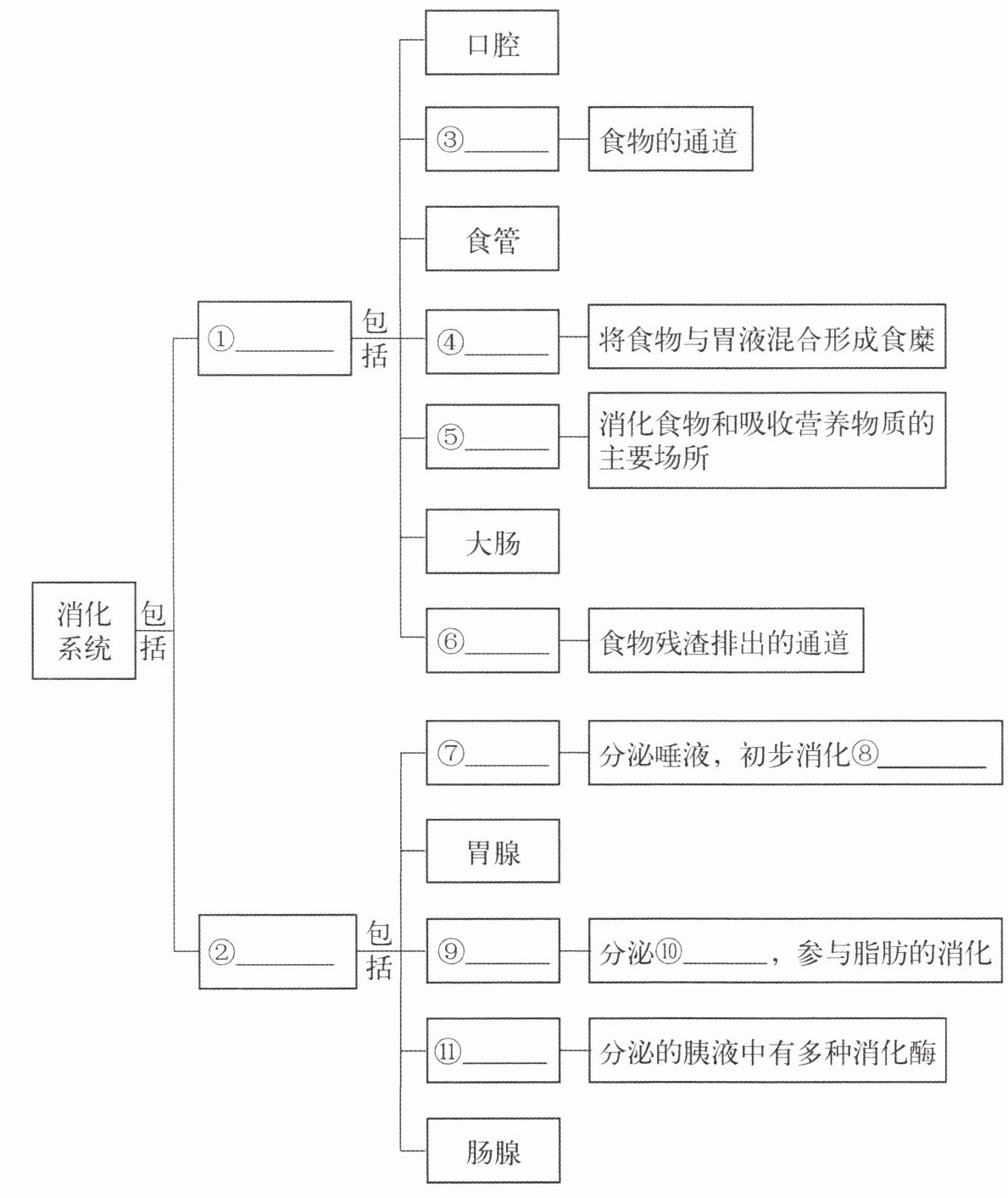 ①消化道;②消化腺;③咽;④胃;⑤小肠;⑥肛门;⑦唾液腺;⑧淀粉;⑨肝脏;⑩胆汁;⑪胰腺