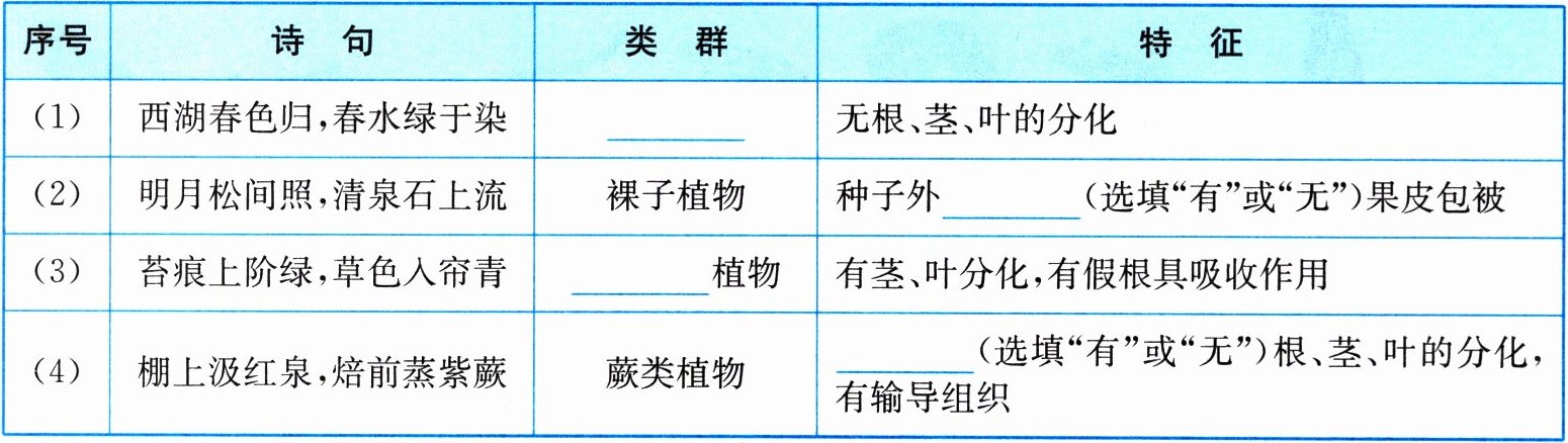 26.(4分)凝练隽永的古诗词中蕴含丰富的生物学知识,将下列诗句中描述的植物与其所属的植物类群和特征不完整处进行补充。