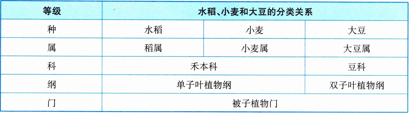 结构。答案:(1)目 (2)水稻(或小麦) 小麦(或水稻) 它们共同所处的分类等级较低,相似程度较大,亲缘关系较近 (3)果实(或种子)