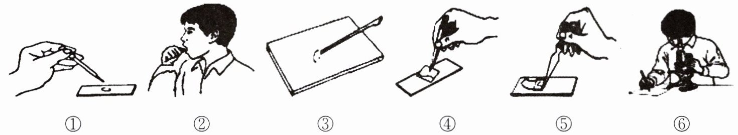 ①在洁净的载玻片中央滴一滴清水;②用凉开水漱口后,用消毒牙签稍钝的一端在口腔内侧壁轻轻刮几下;③将牙签上附着的碎屑涂在水滴中,并用镊子分散;④盖上盖玻片;⑤用稀碘液染色;⑥用低倍镜观察。请你根据小明的操作过程,回答下列问题。