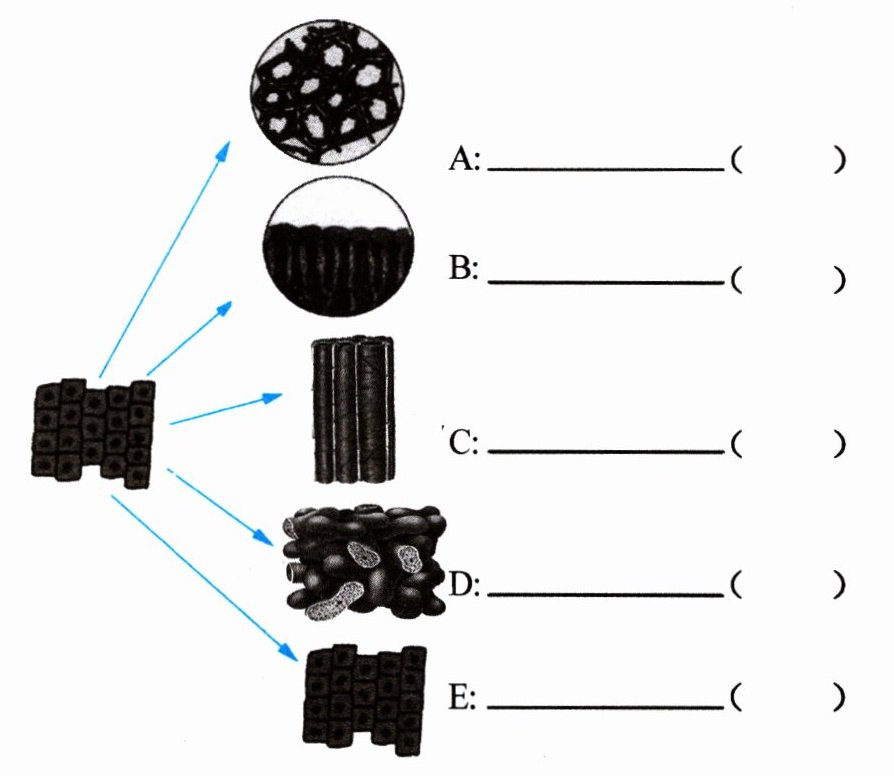)答案:A:机械组织(⑤) B:保护组织(③) C:输导组织(①) D:营养组织(④) E:分生组织(②)