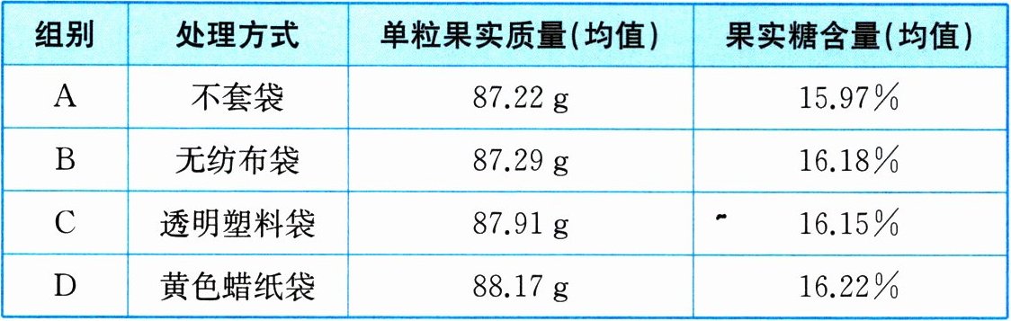 | 组别 | 处理方式 | 单粒果实质量(均值) | 果实糖含量(均值) |