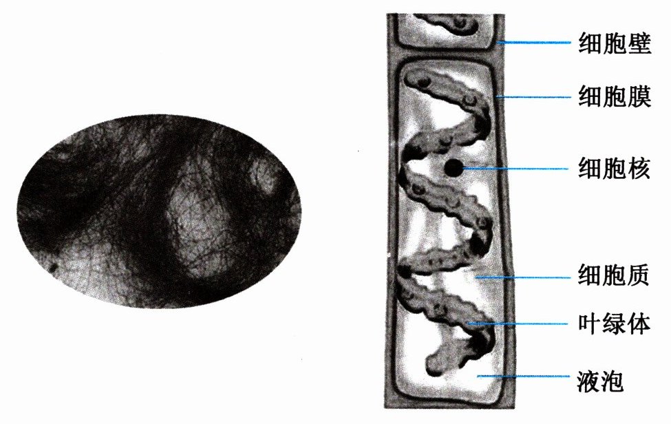 1. 用镊子夹取几根水绵,放在载玻片中央的水滴中,先用放大镜观察水绵的外部形态,再制作临时装片,结合水绵细胞结构示意图,在显微镜下观察。
