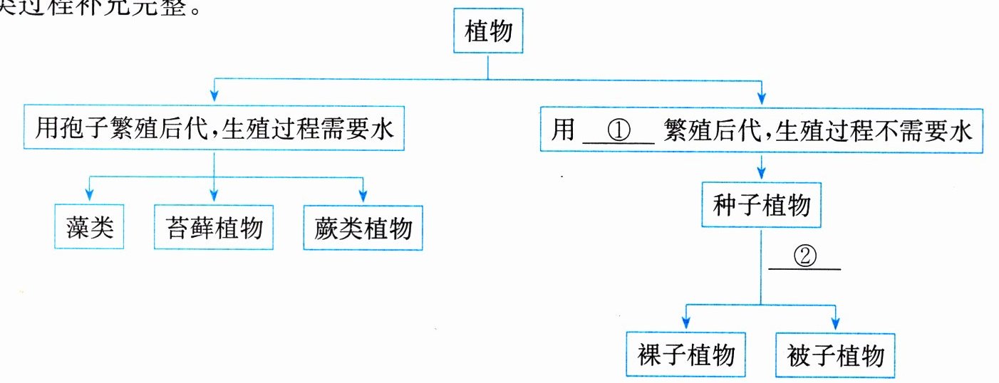 某同学尝试对5种植物进行观察识别,并绘制了如下图所示的分类图示,请帮助将该图示的分类过程补充完整。