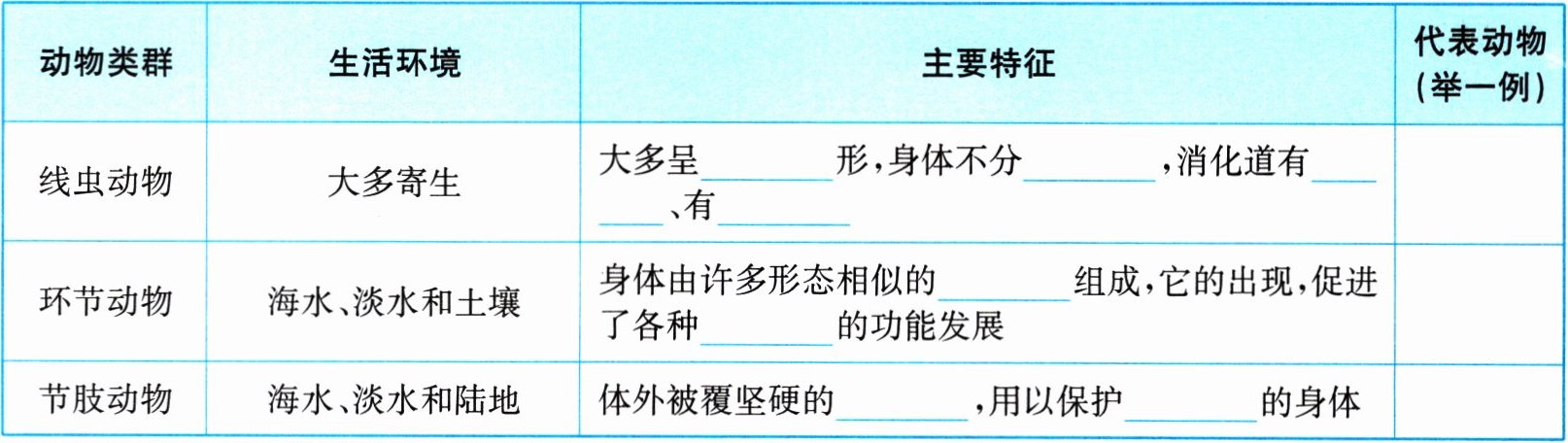 |线虫动物|大多寄生|大多呈线形,身体不分节,消化道有口、有肛门|人蛔虫|