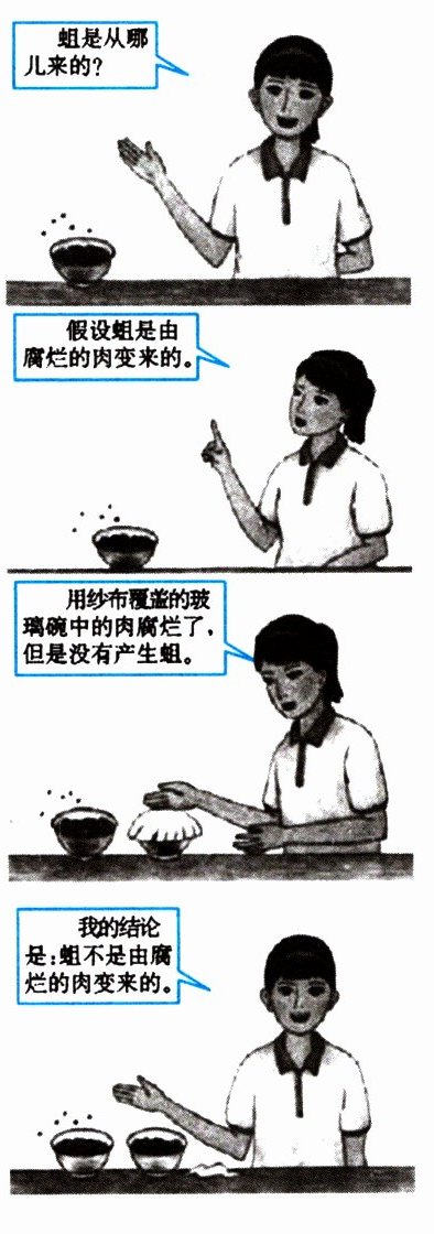 。答案:1. 蛆是从哪儿来的 2. 蛆是由腐烂的肉变来的 3.(1)水 光 温度 时间 体积 (2)实验 对照 变量 (3)相同 相同 温暖且有苍蝇 (4)肉和蝇是否能够直接接触 (5)玻璃碗用纱布覆盖住 玻璃碗不用纱布覆盖住 5. 蛆不是由腐烂的肉变来的