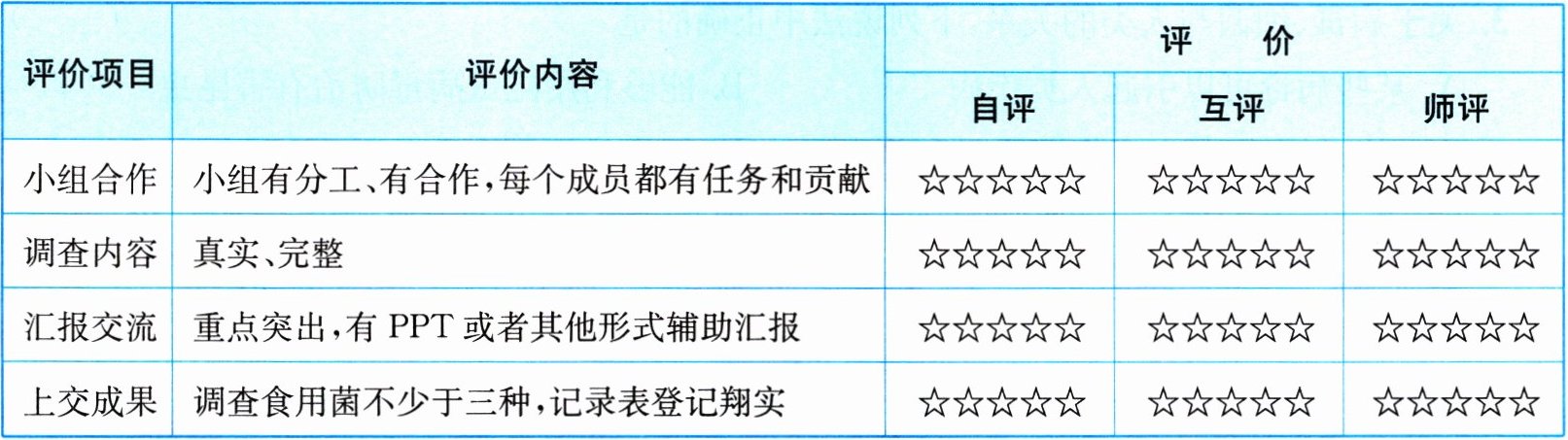 1. 调查场所可根据实际情况选择,如农贸市场。2. 成员分工需合理分配任务,确保各环节有人负责。3. 食用菌选择常见种类,单价和营养价值结合实际调查及资料填写。4. 评价部分根据完成情况客观评定。