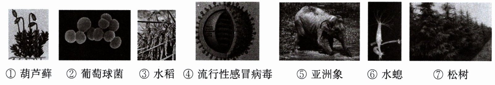 ① 葫芦藓 ② 葡萄球菌 ③ 水稻 ④ 流行性感冒病毒 ⑤ 亚洲象 ⑥ 水螅 ⑦ 松树
