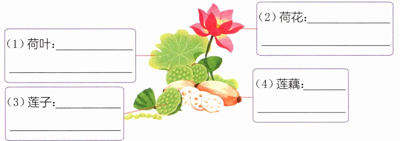 3. 读了短文第 2~3 自然段,我们知道了荷花浑身是宝。根据文中的介绍,写一写荷花各部分对应的用处或功效。