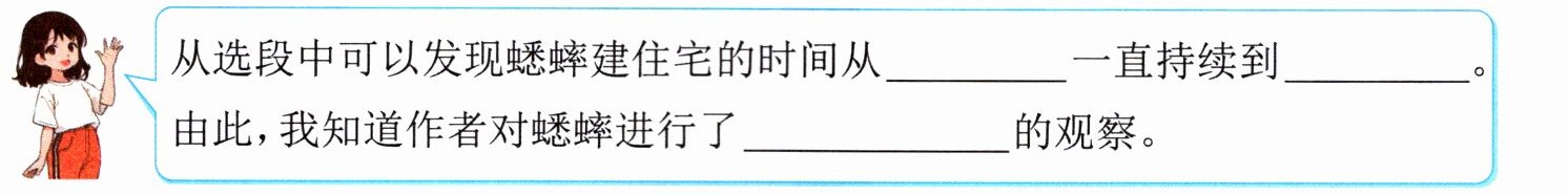 2. (阅读要素)作者是怎样观察蟋蟀盖房子的?请你将下面的对话补充完整。