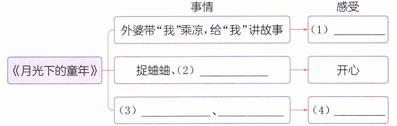 1. (思维导图)不同的事,让“我”有着不同的感受。请结合短文,填写思维导图。
