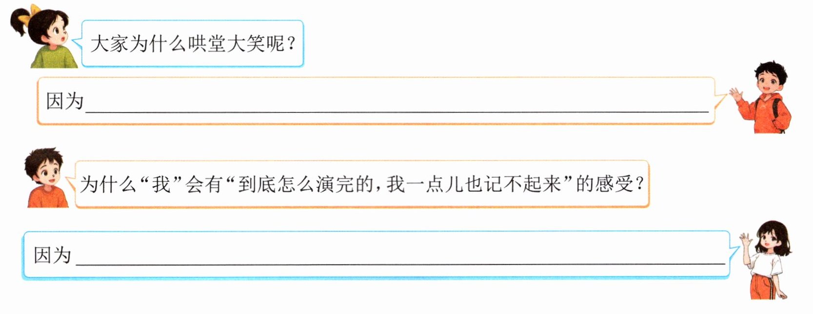 2. (情境学习)读了课文片段,小朋友们对“我”演大老虎的环节非常感兴趣,纷纷讨论起来,请你帮助他们完成对话。