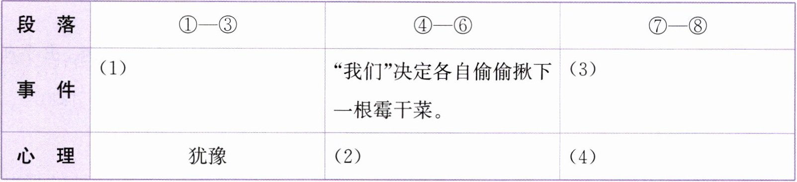 (1)看到霉干菜很想吃,却因其有主人不敢拿。(2)紧张害怕 (3)品尝偷来的霉干菜,觉得不好吃。(4)失望不已