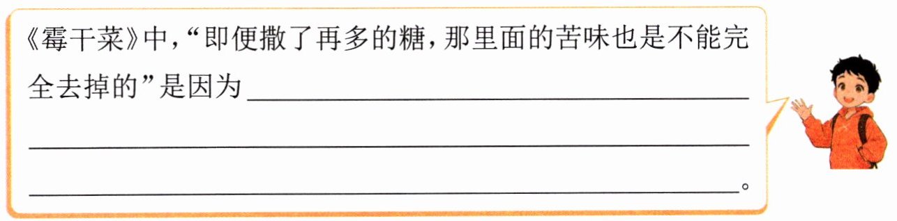 4. 作者在第①自然段细细描写了霉干菜的滋味,但结尾却说“即便撒了再多的糖,那里面的苦味也是不能完全去掉的”,这两处是否矛盾?为什么?