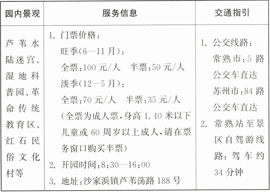 答案:(1)× 解析:湿地是全球重要生态系统之一。(2)× 解析:材料中并未提到湿地具有“防洪防潮”的生态功能。(3)× 解析:在沙家浜国家湿地公园,到访者只能坐在船上,与鸟类专属的栖居地隔水相望。(4)√ 解析:小苏不足1.40米,可以购半票。爷爷65周岁,可以购半票,暑假期间,半票价格为50元/人。因此,他俩购票需花费100元。