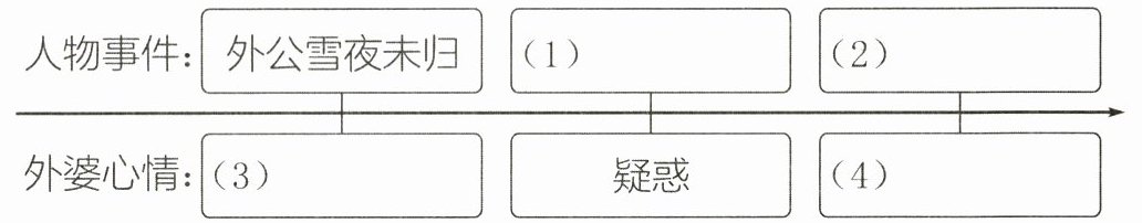 答案:(1)外曾祖母说外公不会回来(2)外婆不再熬夜等外公(3)担忧(4)安心(5)外公为了让家人放心、邻居安心,选择了独自雪夜归家报平安。