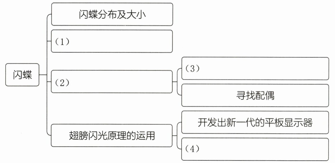 答案:1. (1)闪蝶闪光的原因 (2)闪蝶闪光的作用 (3)保护自己 (4)研发出新型布料 2. 闪蝶翅膀上那绚丽的金属光泽,璀璨夺目。