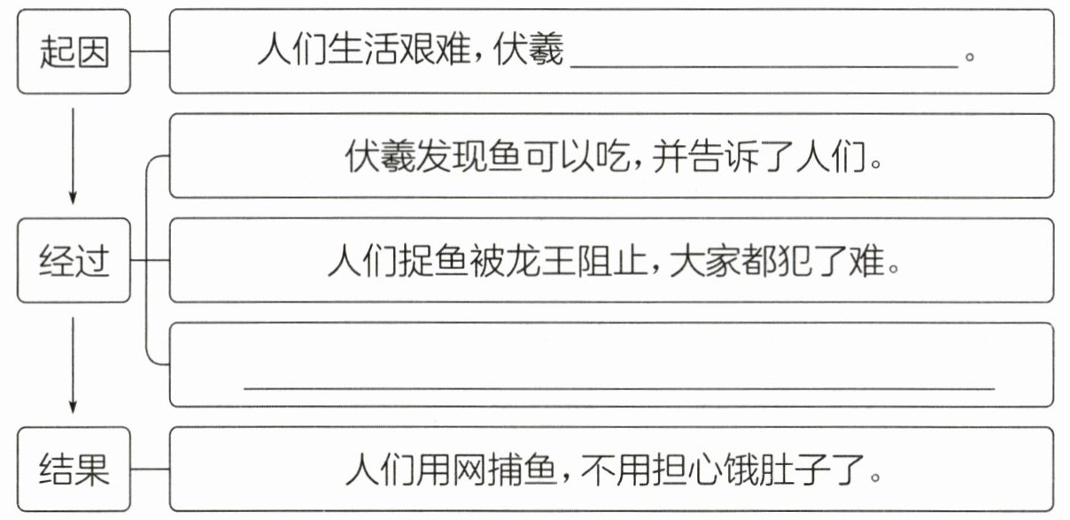 ④ 怎样才能不直接用手捉鱼呢?伏羲忽然看见蜘蛛织网,把飞过来的小虫子网住。他灵机一动,有了办法。伏羲像蜘蛛织网那样,把藤条纵横交错地绑在一起,编成一张大网,再把木棍绑在网上,放进河里一捞,就捞上来好几条大鱼!他非常高兴,跑到高高的山上,凭借神力找来了许多藤条和木棍,做成一张又一张的大网,送给人们,并教给他们结网捕鱼的方法。龙王见状,只能有苦说不出。