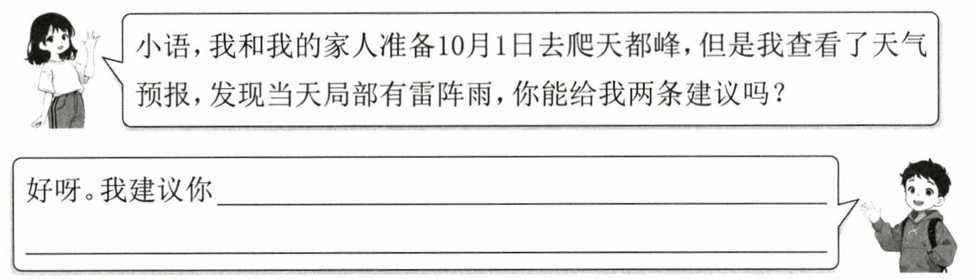 答案:1.(1)√ (2)× (3)× 解析:寒假期间,天都峰不开放,力力和爸爸不可以去爬天都峰,故(2)错误。游览时要注意安全,一定要做到“看景不走路,走路不看景”,小亮“一边走路一边欣赏景色”,同时与同伴说笑的做法是不对的,故(3)错误。 2. 示例:小乐,我们不能在奇石上乱涂乱画,这是对自然景观的破坏,而且违反了景区的管理规定。 解析:劝说时,先表明小乐的想法是错误的,然后说明错误的原因,注意语言得体,要达到劝阻的目的。 3. 示例:① 随身携带雨衣;② 雷雨到来时,不宜在高峰处停留,不宜手扶铁索,不要在大树下避雨。